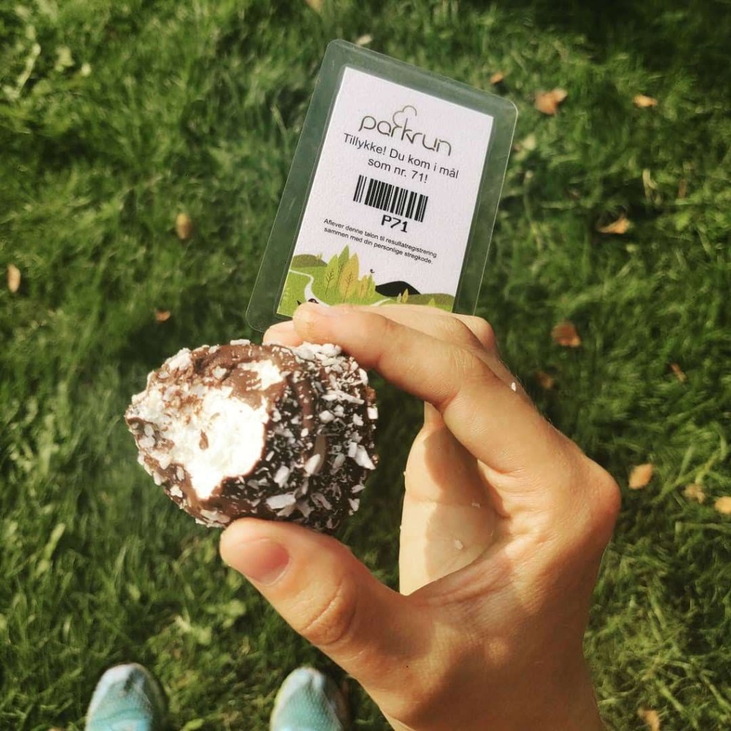 I got home late but still sober, and I woke up for my 5k feeling decently alive. Even though it was only a really casual parkrun, I was looking forward to it. Registering online to run 5 km and running 5 km on your own just hits different, I guess. Nice people, flat track, and it was over before I knew it. When we queued up to register our times after the finish line they were handing out flødeboller, which are these marshmallowy, meringuey, chocolate covered sweets. I will not reveal what my time was because it was not very good, but I will reveal pictures of my half-eaten flødebolle because it was very good. It was the perfect snack to conclude a weird choice I made last week.
